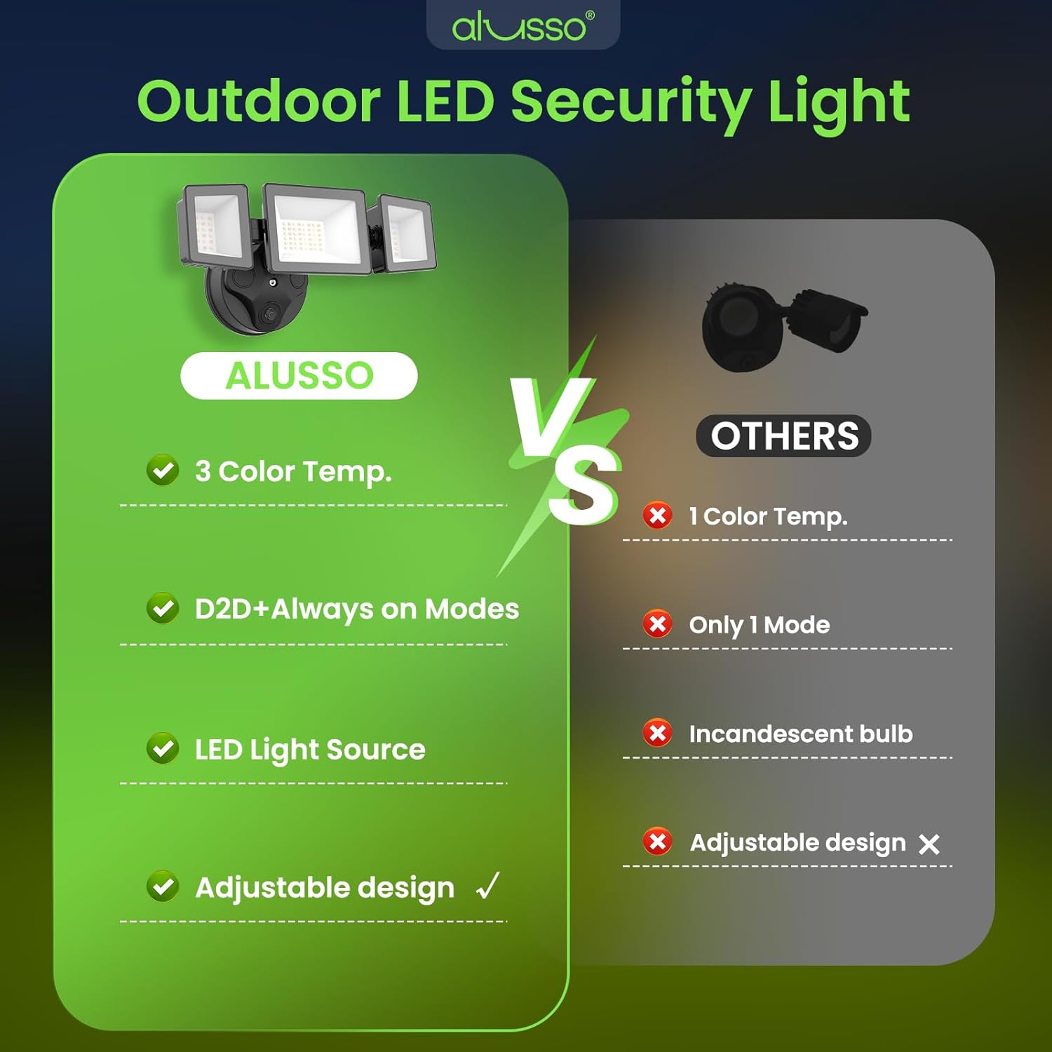 The best security light depends on your needs. Motion-sensor lights are ideal for automatic activation, while manual control security lights are great for users who want consistent, on-demand lighting without false triggers. ALUSSO security lights are designed for reliable outdoor illumination with stable performance.